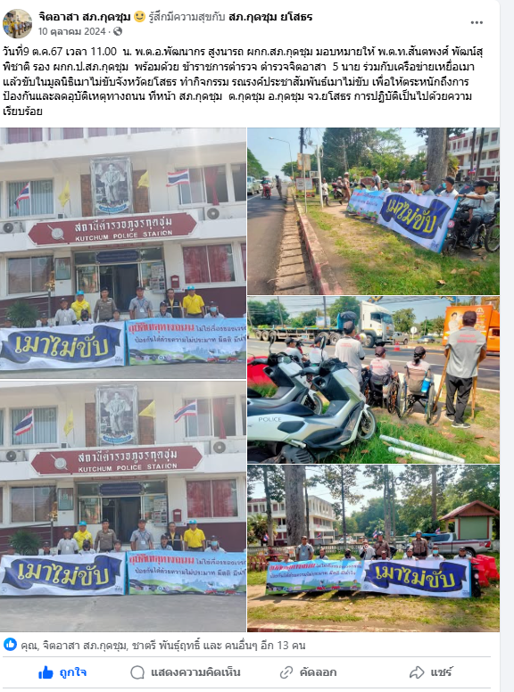 วันที่9 ต.ค.67 เวลา 11.00 น. พ.ต.อ.พัฒนากร สูงนารถ ผกก.สภ.กุดชุม มอบหมายให้ พ.ต.ท.สันตพงศ์ พัฒน์สุพิชาติ รอง ผกก.ป.สภ.กุดชุม พร้อมด้วย ข้าราชการตำรวจ ตำรวจจิตอาสา 5 นาย ร่วมกับเครือข่ายเหยื่อเมาแล้วขับในมูลนิธิเมาไม่ขับจังหวัดยโสธร ทำกิจกรรม รณรงค์ประชาสัมพันธ์เมาไม่ขับ เพื่อให้ตระหนักถึงการป้องกันและลดอุบัติเหตุทางถนน ทีหน้า สภ.กุดชุม ต.กุดชุม อ.กุดชุม จว.ยโสธร การปฏิบัติเป็นไปด้วยความเรียบร้อย