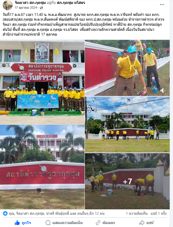 วันที่17 ต.ค.67 เวลา 11.40 น. พ.ต.อ.พัฒนากร สูงนารถ ผกก.สภ.กุดชุม พ.ต.ท.วารินทร์ ขยันทำ รอง ผกก.(สอบสวน)สภ.กุดชุม พ.ต.ท.สันตพงศ์ พัฒน์สุพิชาติ รอง ผกก.ป.สภ.กุดชุม พร้อมด้วย ข้าราชการตำรวจ ตำรวจจิตอา สภ.กุดชุม ร่วมทำกิจกรรมบำเพ็ญสาธารณประโยชน์ปรับปรุงภูมิทัศน์ ทาสีป้าย สภ.กุดชุม กิจกรรมปลูกต้นไม้ พื้นที่ สภ.กุดชุม ต.กุดชุม อ.กุดชุม จว.ยโสธร เพื่อสร้างความรักความสามัคคี เนื่องในวันสถาปนาสำนักงานตำรวจแห่งชาติ 17 ตุลาคม