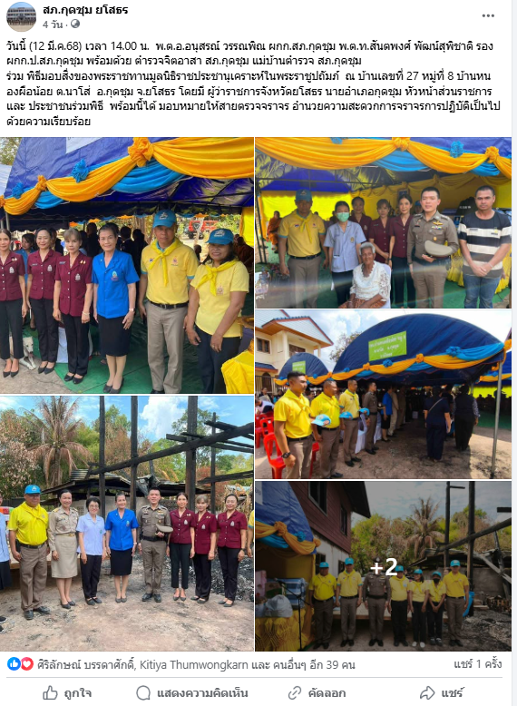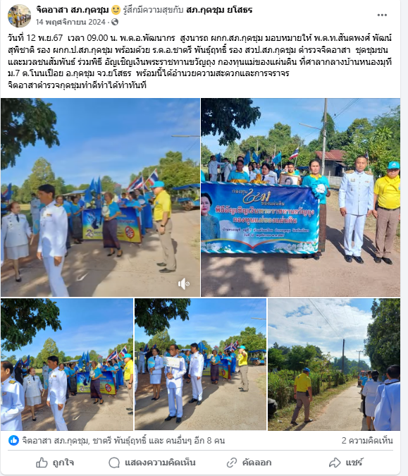 ร่วม พิธีมอบสิ่งของพระราชทานมูลนิธิราชประชานุเคราะห์ในพระราชูปถัมภ์ ณ บ้านเลขที่ 27 หมู่ที่ 8 บ้านหนองผือน้อย ต.นาโส่ อ.กุดชุม จ.ยโสธร โดยมี ผู้ว่าราชการจังหวัดยโสธร นายอำเภอกุดชุม หัวหน้าส่วนราชการและ ประชาชนร่วมพิธี พร้อมนี้ได้ มอบหมายให้สายตรวจจราจร อำนวยความสะดวกการจราจรการปฏิบัติเป็นไปด้วยความเรียบร้อย
