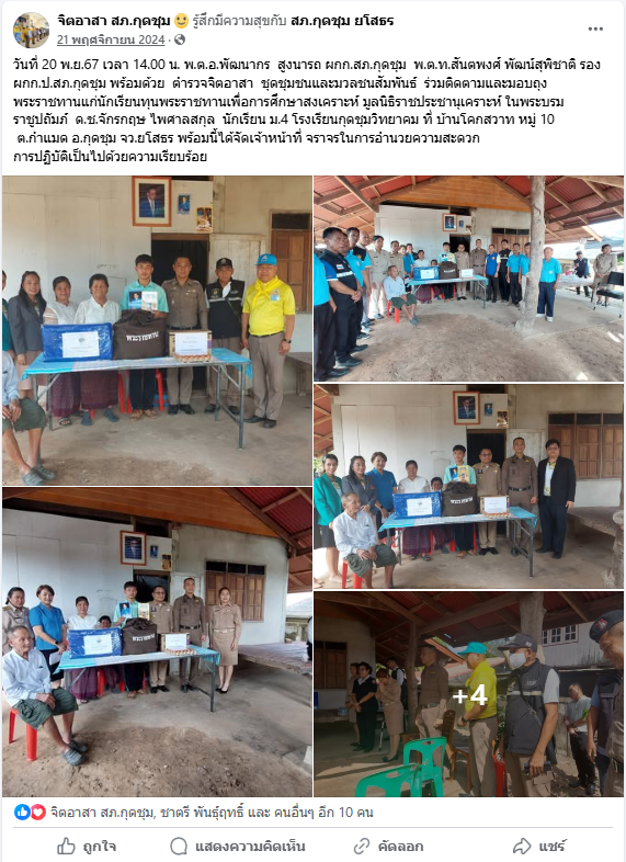 วันที่ 20 พ.ย.67 เวลา 14.00 น. พ.ต.อ.พัฒนากร สูงนารถ ผกก.สภ.กุดชุม พ.ต.ท.สันตพงศ์ พัฒน์สุพิชาติ รอง ผกก.ป.สภ.กุดชุม พร้อมด้วย ตำรวจจิตอาสา ชุดชุมชนและมวลชนสัมพันธ์ ร่วมติดตามและมอบถุงพระราชทานแก่นักเรียนทุนพระราชทานเพื่อการศึกษาสงเคราะห์ มูลนิธิราชประชานุเคราะห์ ในพระบรมราชูปถัมภ์ ด.ช.จักรกฤษ ไพศาลสกุล นักเรียน ม.4 โรงเรียนกุดชุมวิทยาคม ที่ บ้านโคกสวาท หมู่ 10