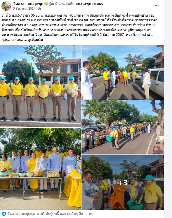 วันที่ 5 ธ.ค.67 เวลา 06.30 น. พ.ต.อ.พัฒนากร สูงนารถ ผกก.สภ.กุดชุม พ.ต.ท.สันตพงศ์ พัฒน์สุพิชาติ รอง ผกก.ป.สภ.กุดชุม พ.ต.ท.กฤษฎา ประสมพันธ์ สวป.สภ.กุดชุม มอบหมายให้ เจ้าหน้าที่ตำรวจ สายตรวจจราจร ตำรวจจิตอาสา สภ.กุดชุม อำนวยความสะดวก การจราจร และบริการประชาชนส่วนราชการ ที่มาร่วม ทำบุญตักบาตร เนื่องในวันคล้ายวันพระบรมราชสมภพพระบาทสมเด็จพระบรมชนกาธิเบศรมหาภูมิพลอดุลยเดชมหาราชบรมนาถบพิตร(วันชาติและวันพ่อแห่งชาติ)ในวันพฤหัสบดีที่ 5 ธันวาคม 2567 หน้าที่ว่าการอำเภอกุดชุม ต.กุดชุม อ.กุดชุม จว.ยโสธร การปฏิบัติเป็นไปด้วยความเรียบร้อย