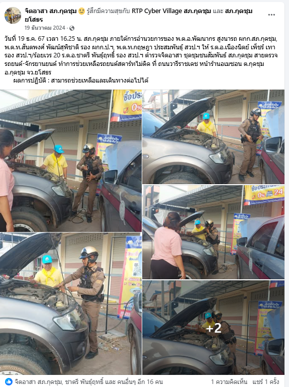 วันที่ 19 ธ.ค. 67 เวลา 16.25 น. สภ.กุดชุม ภายใต้การอำนวยการของ พ.ต.อ.พัฒนากร สูงนารถ ผกก.สภ.กุดชุม, พ.ต.ท.สันตพงศ์ พัฒน์สุพิชาติ รอง ผกก.ป.ฯ, พ.ต.ท.กฤษฎา ประสมพันธุ์ สวป.ฯ ให้ ร.ต.อ.เนืองนิตย์ เพ็ชร์ เทา รอง สวป.ฯ/ร้อยเวร 20 ร.ต.อ.ชาตรี พันธุ์ฤทธิ์ รอง สวป.ฯ ตำรวจจิตอาสา ชุดชุมชนสัมพันธ์ สภ.กุดชุม สายตรวจรถยนต์-จักรยานยนต์ ทำการช่วยเหลือรถยนต์สตาร์ทไม่ติด ที่ ถนนวารีราชเดช หน้าร้านอเมซอน ต.กุดชุม อ.กุดชุม จว.ยโสธร