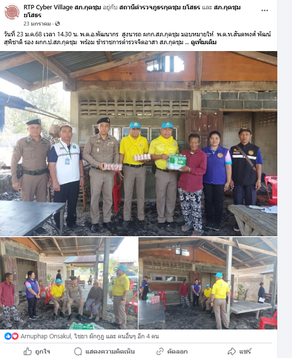 วันที่ 23 ม.ค.68 เวลา 14.30 น. พ.ต.อ.พัฒนากร สูงนารถ ผกก.สภ.กุดชุม มอบหมายให้ พ.ต.ท.สันตพงศ์ พัฒน์สุพิชาติ รอง ผกก.ป.สภ.กุดชุม พร้อม ข้าราชการตำรวจจิตอาสา สภ.กุดชุม เยี่ยมมอบสิ่งของน้ำดื่มอาหารกระป๋อง เพื่อเป็นกำลังใจ ให้ครอบครัวผู้ประสบภัย (อัคคีภัย) บ้านเลขที่ 19 หมู่ 12 บ้านน้อย ต. กุดชุม อ.กุดชุม จว.ยโสธร