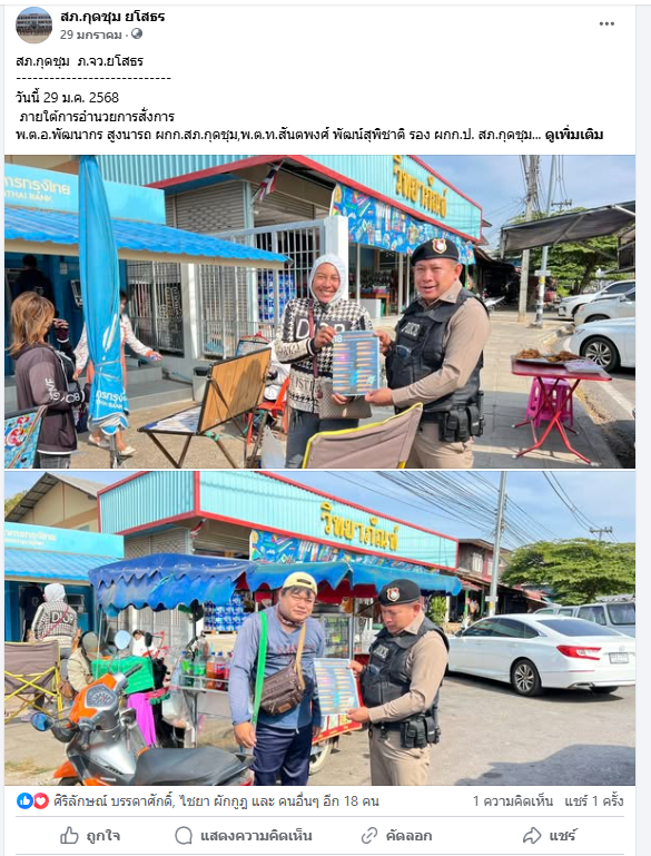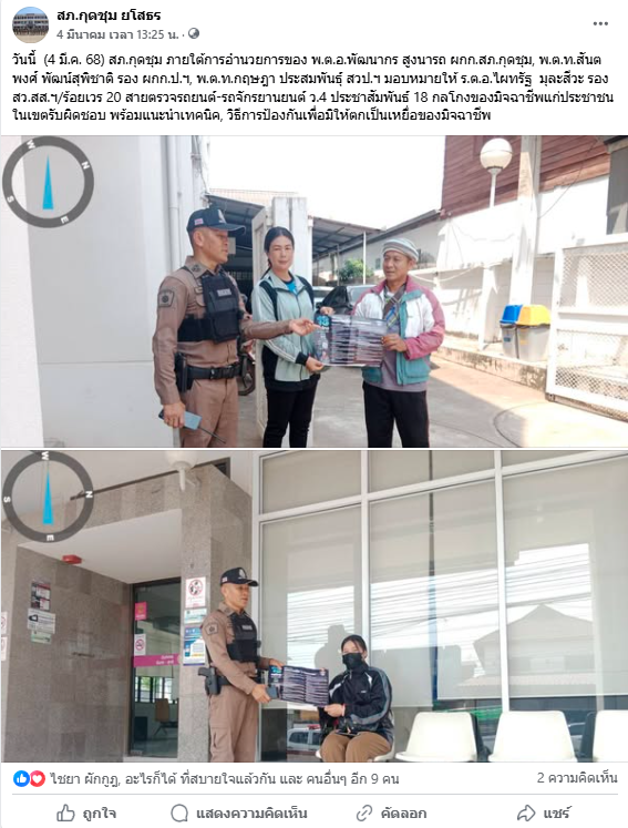 วันนี้ (4 มี.ค. 68) สภ.กุดชุม ภายใต้การอำนวยการของ พ.ต.อ.พัฒนากร สูงนารถ ผกก.สภ.กุดชุม, พ.ต.ท.สันตพงศ์ พัฒน์สุพิชาติ รอง ผกก.ป.ฯ, พ.ต.ท.กฤษฎา ประสมพันธุ์ สวป.ฯ มอบหมายให้ ร.ต.อ.ไผทรัฐ มุละสีวะ รอง สว.สส.ฯ/ร้อยเวร 20 สายตรวจรถยนต์-รถจักรยานยนต์ ว.4 ประชาสัมพันธ์ 18 กลโกงของมิจฉาชีพแก่ประชาชนในเขตรับผิดชอบ พร้อมแนะนำเทคนิค, วิธีการป้องกันเพื่อมิให้ตกเป็นเหยื่อของมิจฉาชีพ