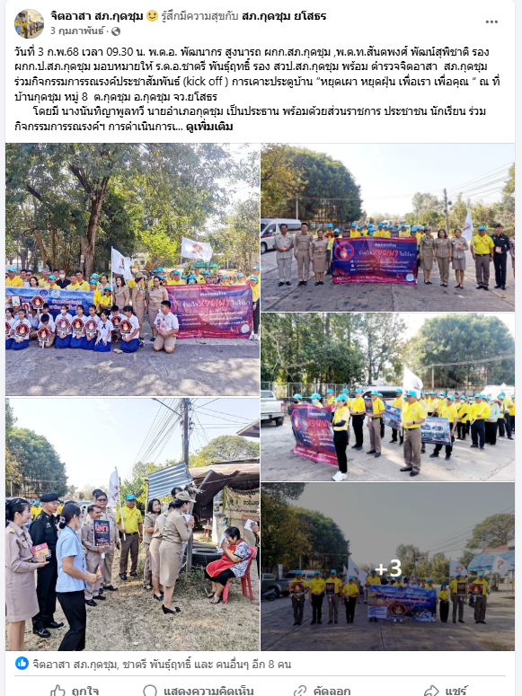 นที่ 3 ก.พ.68 เวลา 09.30 น. พ.ต.อ. พัฒนากร สูงนารถ ผกก.สภ.กุดชุม ,พ.ต.ท.สันตพงศ์ พัฒน์สุพิชาติ รอง ผกก.ป.สภ.กุดชุม มอบหมายให้ ร.ต.อ.ชาตรี พันธุ์ฤทธิ์ รอง สวป.สภ.กุดชุม พร้อม ตำรวจจิตอาสา สภ.กุดชุม ร่วมกิจกรรมการรณรงค์ประชาสัมพันธ์ (kick off ) การเคาะประตูบ้าน ”หยุดเผา หยุดฝุ่น เพื่อเรา เพื่อคุณ “ ณ ที่บ้านกุดชุม หมู่ 8 ต.กุดชุม อ.กุดชุม จว.ยโสธร